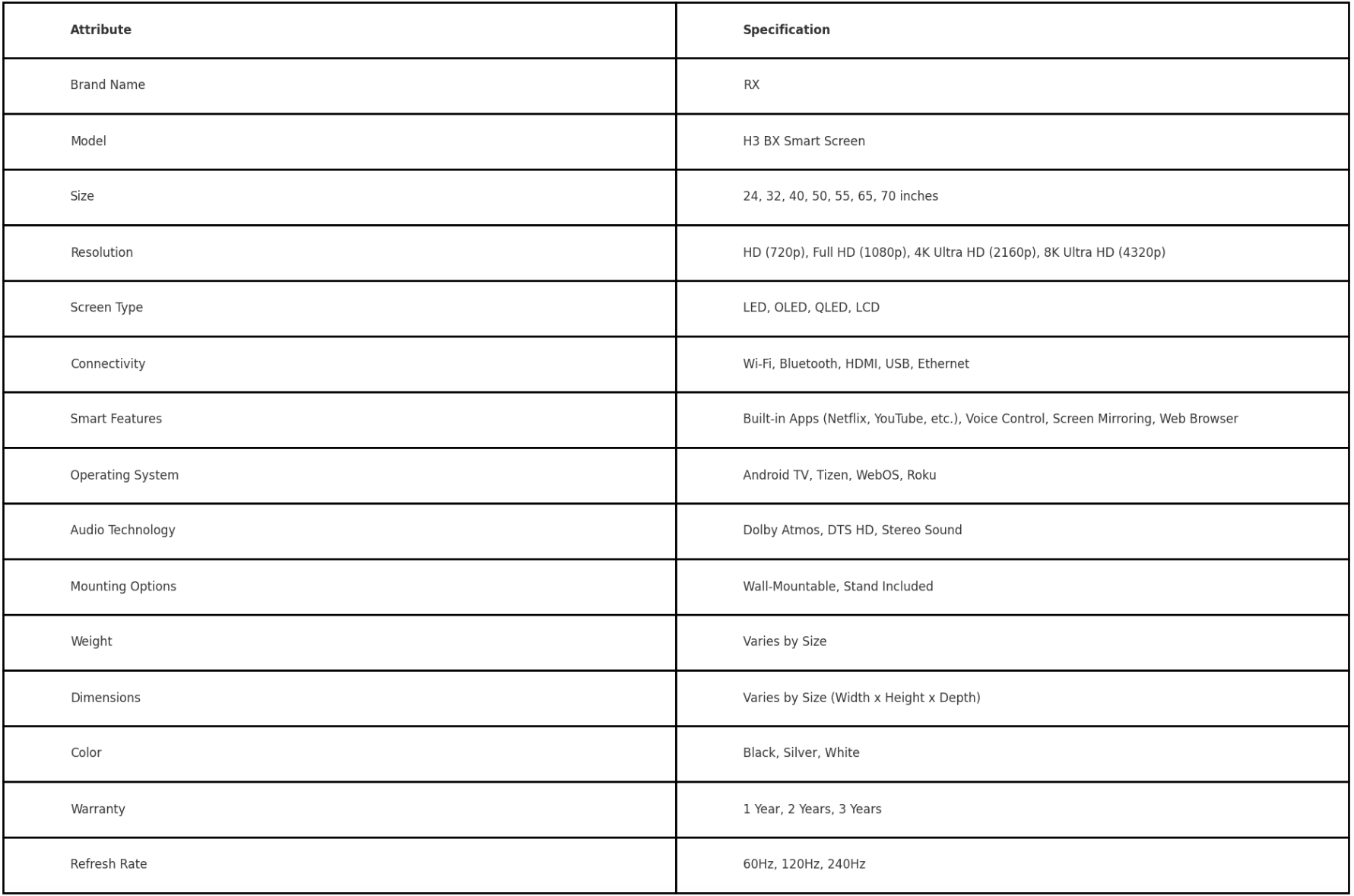 The H3 BX Smart Screen is available in various sizes, including 24 inches, 32 inches, 40 inches, 50 inches, 55 inches, 65 inches, and 70 inches, with resolutions ranging from HD (720p) and Full HD (1080p) to 4K Ultra HD (2160p) and 8K Ultra HD (4320p). It features multiple screen types, such as LED, OLED, QLED, and LCD, and offers comprehensive connectivity options, including Wi-Fi, Bluetooth, HDMI, USB, and Ethernet. The smart screen is equipped with built-in apps like Netflix and YouTube, voice control, screen mirroring, and a web browser. It supports various operating systems like Android TV, Tizen, WebOS, and Roku, and offers advanced audio technologies such as Dolby Atmos, DTS HD, and stereo sound. The screen is wall-mountable and comes with a stand included. The weight and dimensions vary depending on the size, and it is available in colors like black, silver, and white. The H3 BX Smart Screen comes with warranty options of 1, 2, or 3 years and offers refresh rates of 60Hz, 120Hz, and 240Hz.